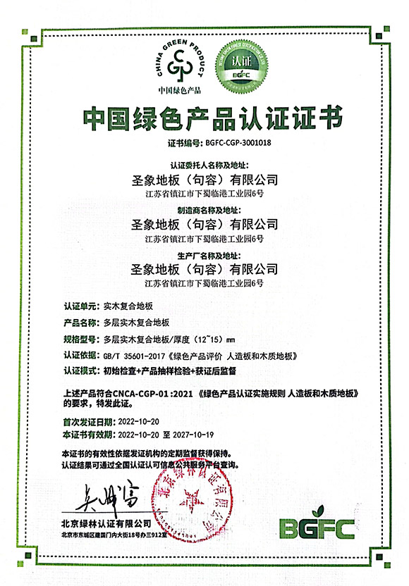中國綠色產品認證證書