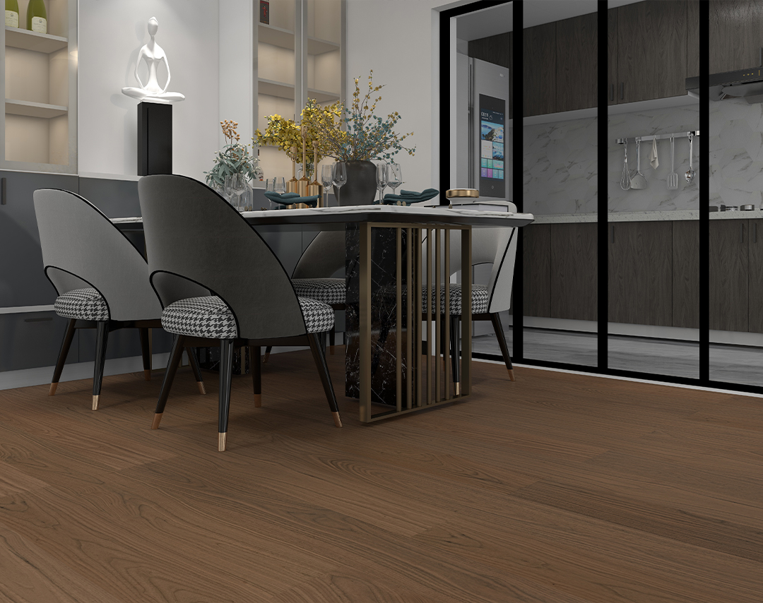 經(jīng)典黑胡桃色,紋理自然和諧,細膩的淺拉絲表面,遠看是大氣的紋理,近看是細膩的拉絲,遠近不同的視覺效果,給家裝空間增添一股樂趣。